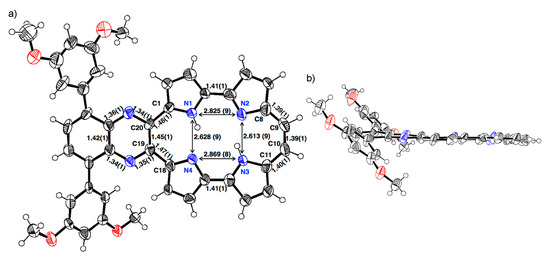 The single crystal of 1b-H2 was obtained from a mixture of THF/methanol/trifluoroacetic acid (TFA) (Figure 2). The porphycene core forms a highly planar structure in which a mean-plane deviation of 24 porphycene atoms is 0.046 Å. The porphycene and quinoxaline units are slightly tilted and the dihedral angle of each plane is 8.07°. The 3,5-dimethoxybenzene on quinoxaline moiety makes the angles of 45.10° and 45.38°, which are consistent with those of 2b. The distances of N1–N4 and N2–N3 are 2.628(9) and 2.613(9) Å, respectively, which values are comparable with that of Pc (2.63 Å) [1] and longer than those of m-MBPc (2.578 and 2.589 Å) and m-DBPc (2.54 Å) [20]. The distances of C8–C9 (1.39(1) Å) and C10–C11 (1.40(1) Å) are consistent with those of Pc (<1.40 Å) [1]. In contrast, the bond lengths of the opposite side, C1–C20 and C18–C19 exhibit slightly longer distances (1.48(1) and 1.47(1) Å).