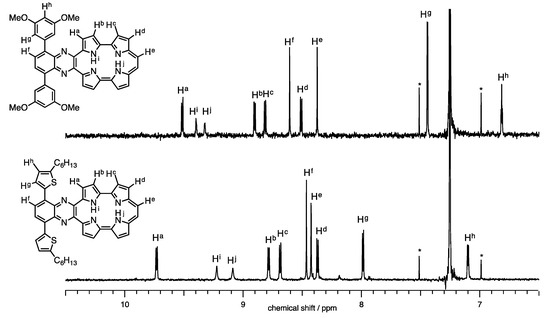 The single crystal X-ray structures of 2a and 2b are shown in Figure S1 in Supplementary Materials. The NH groups of pyrroles face nitrogen atoms in the quinoxaline moiety in the formation of the hydrogen bondings. The thiophenes and quinoxaline of 2a consist of relatively planar structures with twisted angles 12.35° and 10.38° facilitating nitrogen-sulfur interactions. On the other hand, 2b shows larger twisted angles (40.82° and 47.07°) between dimethoxybenzenes and quinoxaline.