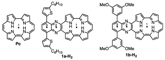 X-ray crystallographic data for 2a and 2b were recorded at 90 K on an APEX II X-ray diffractometer (Bruker, Billerica, MA, USA) equipped with a large area CCD detector and graphite monochromated Mo-Kα radiation and the data for 1b-H2 and 1a-H2 were recorded at 103 K on a R-AXIS RAPID/S instrument (Rigaku, Akishima, Japan) using Mo-Kα radiation. The structure was solved by direct methods with SHELXS-97 [33] and refined by full-matrix least-squares techniques against F2 (SHELXL-97) [33]. The intensities were corrected for Lorentz and polarization effects. The non-hydrogen atoms were refined anisotropically. Hydrogen atoms were refined using the riding model. All calculations were performed using Crystal Structure 4.0 or Yadokari-XG 2011. Crystallographic data for 1b-H2: C42H32N6O4, Mw = 684.74, orthorhombic, space group Pna21 (#33), a = 28.452, b = 30.414, c = 3.827 Å, V = 3311.3 Å3, T = 103(2) K, Z = 4, reflections measured 39,848, 5127 unique. The final R1 was 0.0880 (I > 2σ(I)), and the final wR on F2 was 0.2299 (all data), GOF = 1.019. CCDC No. 1543213 contains the supplementary crystallographic data for this paper. These data can be obtained free of charge via http://www.ccdc.cam.ac.uk/conts/retrieving.html (or from the CCDC, 12 Union Road, Cambridge CB2 1EZ, UK; Fax: +44 1223 336033; E-mail: deposit@ccdc.cam.ac.uk).