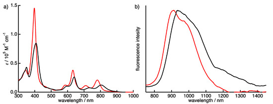 The absorption and fluorescence spectra of 1a-H2 and 1b-H2 were measured in CH2Cl2 (Figure 5). Typically, porphycene exhibits strong Soret bands around 370 nm and three Q-bands peak-tops at 550 to 660 nm. The 1a-H2 and 1b-H2 show significantly red-shifted absorption compared with Pc due to the expansion of the π-conjugation attached with quinoxaline moieties on the porphycene core. The Soret bands of 1a-H2 and 1b-H2 are observed at 407 and 397 nm, respectively, associated with four Q-bands peak-tops. The longest absorption peaks are detected at 814 nm for 1a-H2 and 781 nm for 1b-H2. Furthermore, the absorption of 1a-H2 shows red-shift compared with that of 1b-H2 since the coplanarity between thiophene and quinoxaline moiety is higher than that of the 3,5-dimethoxy-benzene of 1b-H2. This indicates that the optical property could be customized by the substitutions on the quinoxaline moiety. The compounds 1a-H2 and 1b-H2 show fluorescence at the NIR regions. The fluorescence peak tops of 1a-H2 and 1b-H2 are observed at 935 and 911 nm with quantum yields at 0.16% and 0.20%, as determined by the indocyanine green standards [27].