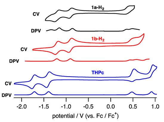 To elucidate the electronic properties, cyclic voltammetry (CV) and differential pulse voltammetry (DPV) in CH2Cl2 containing tetrabutylammonium hexafluorophosphate (TBAPF6) as an electrolyte were performed (Figure 6). The compounds 1a-H2 and 1b-H2 exhibited two reversible reduction waves and one quasi-reversible oxidation wave.