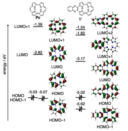 Kohn-Sham molecular orbitals and energy diagrams of Pc and 1′.
