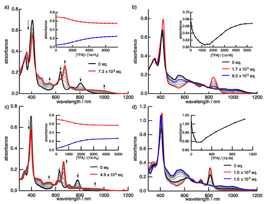 The TFA titration of the absorption spectra of (a) 1a-H2, (b) 1a-Ni, (c) 1b-H2 and (d) 1b-Ni in CH2Cl2. Inset: absorbance changes at (a) 405 (red) and 667 nm (blue); (b) at 411 nm; (c) 397 (red) and 665 nm (blue), and (d) 407 nm.