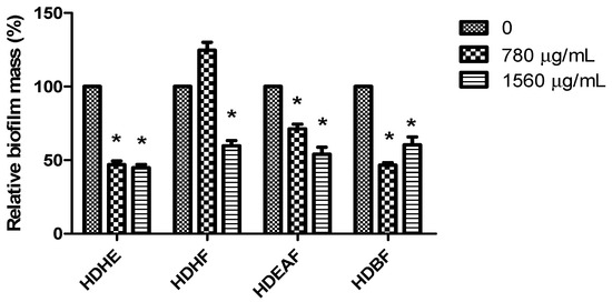 The action of HDHE and its fractions on the biofilm produced by K. pneumoniae was analyzed using sub-inhibitory concentrations (780 µg/mL and 1560 µg/mL). All samples were able to significantly inhibit the biofilm production after 24 h of treatment (p < 0.05), except for the hexane fraction at the concentration of 780 µg/mL (Figure 1). The best results were seen for treatment with 1560 µg/mL (p < 0.05), except for HDHE. Furthermore, the higher reduction in biofilm formation was achieved with HDHE fraction (approximately 50% for both 780 µg/mL and 1560 µg/mL). HDEAF and HDBF showed inhibitory values ranging from 28.73% to 53.4%. In this scenario, HDHE was chosen to be tested against K. pneumoniae for the remaining tests.