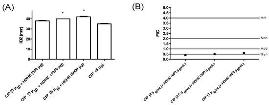 To evaluate the effect of HDHE and its fractions on the action of ciprofloxacin, different amounts of each sample (500 µg, 1000 µg or 5000 µg) were added to disks containing 5 μg of the antibiotic. The amounts of extracts added in each disk were lower than those used in the initial diffusion test (10,000 µg). HDHE was able to significantly increase (p < 0.05) the inhibitory effect of ciprofloxacin when added at 1000 µg or 5000 µg (Figure 2A). The combined effect of the crude extract with ciprofloxacin against K. pneumoniae was confirmed by the determination of FIC. It was observed that two extract/drug combinations resulted in synergistic effects —initial concentrations (drug + extract) of 2.5 µg/mL + 500 µg/mL and 2 µg/mL + 600 µg/mL (FIC ≤ 0.5). The other combination resulted in additive effect (FIC = 0.6)—initial concentrations (drug + extract) of 3 µg/mL + 400 µg/mL—(Figure 2B).