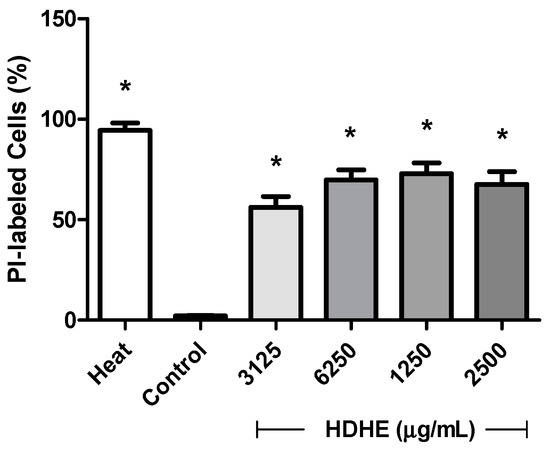 To evaluate the action of HDHE on membrane integrity, the bacteria were treated with different concentrations of the extract (3125, 6250, 12,500 and 25,000 µg/mL) for 4 h and then stained with PI. Untreated cells (negative control) showed low fluorescence intensity indicating intact membrane (approximately 2.13 ± 0.18% of bacterial cells were labeled). On the other hand, the vast majority of bacteria submitted to thermal shock presented damage to the bacterial membrane, as evidenced by PI incorporation (94.4 ± 5.37% of the sample was labeled). After treatment with HDHE, the percentage of dead bacteria (PI+) increased in relation to untreated cells, (the percentage of PI+ cellsranged from 56.2 ± 7.50% to 72.9 ± 7.1%) (Figure 3). No statistically differences were found between the effects of tested HDHE concentrations.