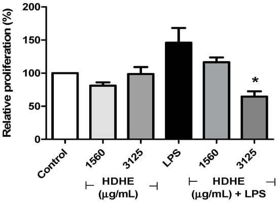 Cytotoxicity of HDHE was evaluated using human erythrocytes and PBMC. It was observed that the extract did not show significant hemolysis at the concentrations tested. Likewise, no significant changes were detected in viability or nitric oxide (NO) production by PBMC incubated with the extract for 24 h (data not shown). Since HDHE did not show significant toxic effects, we evaluated the proliferation of PBMC treated with HDHE in the presence or absence of LPS. After 72 h of cell culture, no significant changes were observed on the proliferation index in HDHE treated or control cells. On the other hand, LPS treated cells exhibited a higher proliferation rate, which was significantly inhibited by HDHE at the concentration of 3125 µg/mL (p < 0.05) (Figure 4).