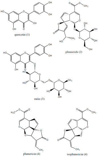 Quercetin (1) appeared as a peak with m/z 303.11 [M + H]+ compatible with the molecular formula C15H10O7. This compound showed a fragmentation pattern with important peaks at m/z 285.26, which was attributed to the loss of H2O, and at m/z 199.00 and 149.88 [38]. Plumieride (2) was identified based on a peak at m/z 471.22 [M + H]+, compatible with the molecular formula C21H26O12. Fragmentation pattern of this peak revealed a loss of water and a glucose unit at m/z = 453.28 and m/z 291.10, respectively [38].