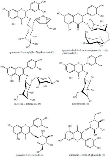 Also, it was detected a peak at at m/z 597.27 [M + H]+, compatible with the molecular formula C26H28O16. Fragmentation of this peak showed that a successive loss of a pentose and hexose unit, leading to the peaks at m/z 465.22 and m/z 303.06, respectively. This compound was identified as quercetin 3-apiosyl-(1->2)-galactoside (5) or quercetin 3-α-l-arabinopyranosyl-(1->6)-galactoside (5) or quercetin 3-lathyroside (5). However, the current study was not able to identify the isomer. The same situation happened with the peak at m/z 460.20 which was attributed to isoquercitrin or quercetin-3-O-glucoside or quercetin-3-β-O-glucoside (6). A loss a glucose unit (C6H10O5) yielded a fragment at m/z 303.04, which characterizes an aglycone ion [38]. In addition, a phenolic acid was identified as a peak at m/z 355.19, which corresponds to the molecular formula C16H18O9. A single fragment at m/z 162.84 was used for comparison with the Metlin database, allowing to identify this compound as chlorogenic acid (8) [38].