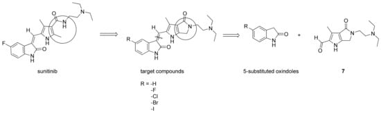 Molecular modeling has indicated that the oxindole moiety of sunitinib, crucial for binding to the ATP binding site of RTKs, occupies the adenine pocket and supplies two hydrogen bonds for binding VEGFR2 (Glu917 and Cys919) [20,21]. Additionally, both the pyrrole functionality and the C(5)-F element of (2-oxoindolin-3-ylidene)methylpyrrole in sunitinib structure enhance affinity by inducing further hydrophobic interactions [20]. In contrast, the water-soluble diethylaminoethyl tail of sunitinib lies on the protein surface [19,22,23]. The RTK inhibitory activity and selectivity of (2-oxoindolin-3-ylidene)methylpyrrole derivatives revealed a strong relationships with structural modifications. Jun changed the methylpyrrole part of sunitinib into a bicyclic N-substituted pyrrolo-fused six-, seven-, and eight-membered heterocycles to obtain a series of more rigid analogs. They discovered certain products as potent inhibitors of VEGFR-2, PDGFRβ and c-kit both enzymatically and cellularly [19]. This study reports the design, synthesis, and structure-activity relationships (SARs) of a series of novel (2-oxoindolin-3-ylidene)methylpyrrole derivatives, bearing at C(5) of oxindole various halogens, fused with an N-substituted 2-pyrrolidone which might result in a smaller, flatter, and more rigid conformation (Figure 2), and thus restrict the ability of the hydrophilic diethylaminoethyl tail to rotate in the hope of facilitating the binding affinity. The target molecules were prepared by condensation of 5-substituted oxindoles with N-substituted 2-pyrrolidone aldehyde 7. Several of the resulting compounds proved to be potent small-molecule kinase inhibitors. Among them, 11 and 12 consistently displayed the most potent activities and favorable selective indexes (SI) and thus were chosen as the candidates for further preclinical development.