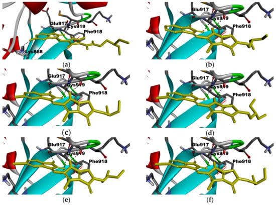 Docked binding modes of 8–12 in ATP binding site of VEGFR-2 (PDB ID: 4AGD) and the crystal structure of VEGFR-2 in complex with sunitinib. (a) sunitinib (from PDB ID: 4AGD) in VEGFR-2; (b) 8 in VEGFR-2; (c) 9 in VEGFR-2; (d) 10 in VEGFR-2; (e) 11 in VEGFR-2; (f) 12 in VEGFR-2. Ligands are shown in yellow sticks; hydrogen bonds are shown as dashed black lines; pi-pi interaction is shown in red line.