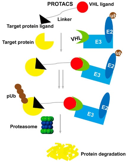 - Sakamoto, K.M. Protacs: Chimeric molecules that target proteins to the Skp1–Cullin–F box complex for ubiquitination and degradation. Proc. Natl. Acad. Sci. USA 2001, 98, 8554–8559. [Google Scholar] [CrossRef] [PubMed]