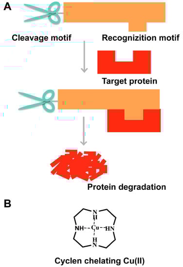 Typical ‘recognition-cleavage’ compounds contain two motifs; one is the recognition group that can bind to the target protein selectively (Figure 2A), and the other is the cleavage group that can cleave the target protein [34,35,36]. The “recognition-cleavage” strategy is also regarded as a promising approach to regulate the protein level.