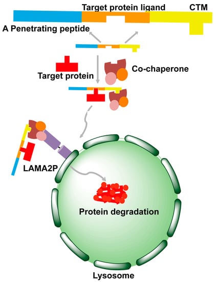 Autophagy is one of the cell quality control systems and contains three types: macroautophagy, microautophagy and chaperone-mediated autophagy (CMA). Among them, CMA can degrade the target protein with specificity [45]. The CMA degradation processing is roughly divided into three steps. Firstly, the target protein containing KFERQ sequence (CMA-targeting motif (CTM)) is recognized by the co-chaperone specifically. Then, the complex of the target protein and co-chaperone binds with LAMA2P. LAMA2P is on the membrane of the lysosome. Finally, the target protein is degraded by the lysosome (Figure 3).