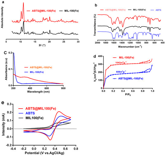 Figure 4. Characterization of the MIL-101(Fe) and ABTS@MIL-100(Fe) nanoparticles. (a) X-ray diffraction patterns; (b) Fourier transform infrared spectra; (c) UV-Vis absorption spectra; (d) N2-adsorption isotherms; (e) Cyclic voltammograms of the MIL-101(Fe), ABTS, and ABTS@MIL-100(Fe) modified Pt electrode at a sweep rate of 20 mV s−1 in 0.05 M acetate buffer at pH 5.5.
