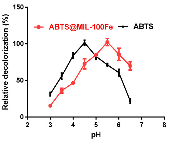 The effect of pH on dye decolorization by laccase using either the free mediator (ABTS) or the immobilized mediator (ABTS@MIL-100(Fe)) was then determined in acetate buffer between pH 3.0 and 6.5 (Figure 5). As shown in the figure, the optimum pH for maximum decolorization by laccase in the presence of ABTS was pH 4.5, likely due to the laccase enzyme activity reaching a maximum when ABTS was used as the substrate [19]. However, the optimum pH for dye decolorization by ABTS@MIL-100(Fe) was pH 5.5.