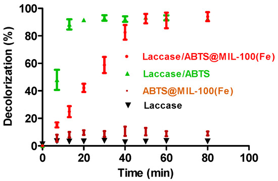 Figure 6. Dye decolorization by the laccase/mediator system, ABTS@MIL-100(Fe), and laccase alone as a function of time. The decolorization conditions were as follows: 50 mg/L dye, 2000 U/L laccase, an immobilized mediator (0.25 g/L for ABTS@MIL-100(Fe)) at pH 5.5 or a free mediator (25 µM for ABTS) at pH 4.5 (in 0.05 M acetate buffer).