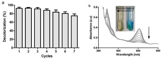 Due to the potential economic benefits, the recovery and reuse of mediators is of particular importance upon the application of the enzyme/mediator system to industry or environmental protection on a large scale. Although ~74% decolorization was obtained following the seventh reuse cycle (Figure 7a), the decolorization efficiency gradually decreased upon increasing the number of cycles, which was attributed to both a loss of ABTS@MIL-100(Fe) during the recovery process and pore blockage by trapped dye degradation products, as previously reported for the catalyzing alcoholysis of styrene oxide by HPW@MIL-101 [39]. Indeed, although the production cost of ABTS@MIL-100(Fe) is slightly higher than that of the free mediator, the immobilized mediator can be easily reused, with large scale application of a reusable mediator likely lowering the relative costs associated with the immobilized mediator.