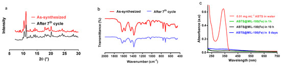 Figure 8. (a) X-ray diffraction patterns of ABTS@MIL-100(Fe) following preparation and after seven reuse cycles; (b) FT-IR spectra of the as-synthesized and recycled ABTS@MIL-100(Fe) samples; (c) UV-Vis spectra of ABTS@MIL-100(Fe) dispersed in water for 1 h, 10 h and 5 days. The spectrum of ABTS is also shown for comparison.