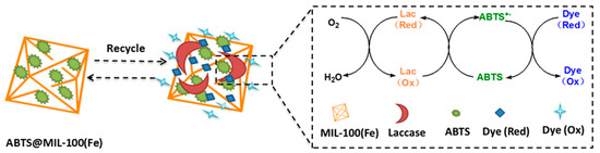 As mentioned previously, laccase belongs to the multicopper oxidase family and its substrate oxidation mechanism involves electron transfer [2]. In this context, the role of ABTS as a mediator in the enzymatic oxidation reaction has been previously described in the literature [39,40]. The encapsulation of laccase in the porosity of MIL-100(Fe) can be ruled out due to the diameter of the mesoporous cages of MOF. However, the enzyme can be adsorbed at the outer surface of MIL-100(Fe) nanoparticles via the repulsive electrostatic interactions. The fact that ABTS entrapped in the MIL-100(Fe) matrix can be catalyzed by laccase had been proved via the electrochemical impedance spectroscopy measurement [26]. As shown in Figure 9, ABTS immobilized in MIL-100(Fe) is first converted into the ABTS+• radical cation via an enzymatic reaction, where molecular oxygen to is reduced to form water. Subsequently, the ABTS+• radical cation takes part in non-enzymatic reactions with the dye species, reducing ABTS+• to ABTS, and oxidizing the dye to complete a single catalytic cycle. This ultimately results in complete decolorization of the dye molecules. In our system, the immobilized ABTS effectively serves as an electron carrier to facilitate oxidation of the dye. On the other hand, Fe(III) in MIL-100(Fe) may be involved in the ABTS-laccase enzymatic reaction since it was previously reported that Fe(III) MOFs are involved in the formation of OH radical by catalyzing the degradation of H2O2 through a Fenton-type reaction [41].