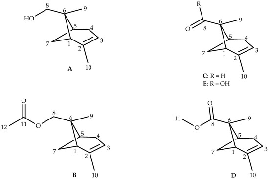The combined use of GC-MS and 13C-NMR for the analysis essential oils obtained from leaf, old branches, and young branches of Calocedrus decurrens led to the identification of 45, 68 and 77 components. These accounted for 93.8%, 99.8% and 89.9% of the respective essential oil compositions. The major monoterpenic constituents identified in leaf, old branches, and young branches EOs were α-pinene (11.2; 56.6; 22.3%), myrcene (13.4; 8.4; 9.6%), Δ-3-carene (31.3; 5.2; 11.1%), limonene (6.4; 5.1; 5.5%), and terpinolene (6.9; 1.5; 3.2%). Other components present at appreciable amounts were pin-2-en-8-ol (A) (up to 10.3% in young branches oil); and pin-2-en-8-yl Acetate (B) (up to 1.4% in young branches oil), whose presence was previously reported in Aristolochia longa EO [12]. Hence, the 13C-NMR data for this both compounds are reported here for the first time. Additionally, two new compounds, pin-2-en-8-al (C) (up to 2.0% in young branches oil) and methyl pin-2-en-8-oate (D) (up to 3.6% in young branches oil) were isolated and fully characterized. Furthermore, we reported the 13C-NMR values of pin-2-en-8-oic acid (E), which is the oxidation product of pin-2-en-8-al (C).