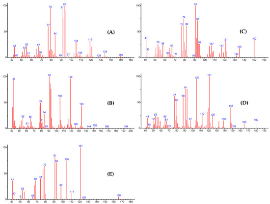High-resolution EI-mass spectra were recorded using an Agilent 7200 GC-QTOF system (Agilent, Santa Clara, CA, USA), equipped with a Agilent J&W, VF-waxMS capillary column (30 m × 0.25 mm; 0.25 μm film thick). The mass spectrometer was operated at 70 eV with an acquisition rate of 2 GHz over a 35−450 m/z range, affording a resolution of ~8000. Injection volume 1 μL; split ratio 1/20; inlet temperature 250 °C, detector temperature 230 °C; column flow (He) 1.2 mL/min; temperature program for oven 60 °C (5 min isotherm) to 240 °C at 5 °C/min (10 min final isotherm).