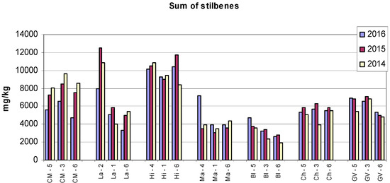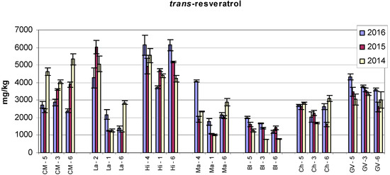 To our knowledge, such an extensive set of data from a three-year study about the content of stilbenes in canes of different varieties of Vitis vinifera L. at various locations has not yet been published in the literature.