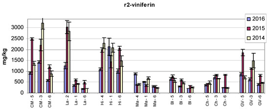 Regarding r2-viniferin, it is interesting that in 2014, the lowest value (statistically significant, p < 0.05) was always recorded at Sampling Site 6 when comparing the same variety. With the exception of the Hibernal variety, the lowest value among different varieties in 2016 was also recorded at Sampling Site 6. Findings in the year 2015 were very diverse.