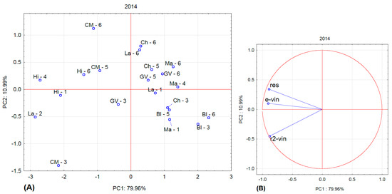 Principal component analysis for 2014. (A) projection of varieties and localities into component plane; (B) projection of component weights of stilbenes.