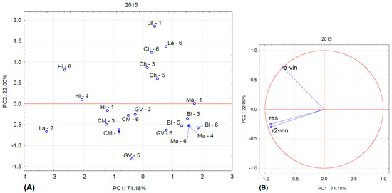 Principal component analysis for 2015. (A) projection of varieties and localities into component plane; (B) projection of component weights of stilbenes.