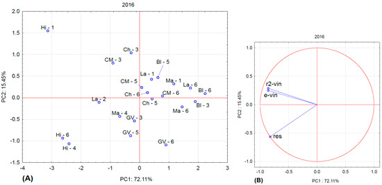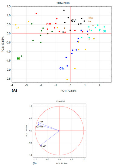 Principal component analysis for 2016. (A) projection of varieties and localities into component plane; (B) projection of component weights of stilbenes.