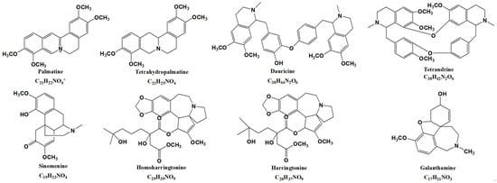 Human gut microbiota represents a complex community of vast and diverse microorganisms that reside in the digestive system and contain a hundred times more genes than our own human genome []. Referred to as a “hidden organ” of the body, the microorganisms are considered to be an important internal environmental factor related to human health and disease; a close association with many health problems has been reported, including obesity, metabolic syndrome, cardiovascular diseases, and diabetes [,,]. A variety of enzymes can be found in the intestinal flora, including β-glucuronidase, β-glucosidase, β-galactase, nitroreductase, azoreductase, 7α-hydroxylase, protease, and various carbohydrates []. These enzymes can interact with drugs and generate many metabolites that differ from those that are generated by other host organs [,], which indicates that the intestinal flora has a good metabolic capacity. This has been a well-studied topic in the field of drug metabolism research, especially with regard to orally administered drugs, as the metabolic reactions by gut microbiota might alter the chemical structure and biological effects of drugs. The metabolites generated by gut microbiota might increase toxicity, show new bioactivities, or promote intestinal absorption by regulation of the gut microbiota [,]. Thus, drug metabolism in the intestinal bacterial is an attractive and indispensable component of pharmaceutical research and drug investigation. In this study, we present eight medicinal isoquinoline alkaloids, palmatine, tetrahydropalmatine, dauricine, tetrandrine, sinomenine, homoharringtonine, harringtonine, and galanthamine, as research topic to demonstrate the significance of drug metabolism by gut microbiota.