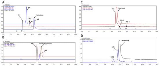 Extracted ion chromatograms (EICs) of metabolites in the incubation of palmatine (A), tetrahydropalmatine (B), dauricine (C), and tetrandrine (D) in the intestinal bacteria in vitro (positive) ion mode, the m/z values in this chromatogram: A, palmatine, 352.1549; M1, 338.1392; M2, 338.1392; M3, 324.1236; M4, 310.1115. B: tetrahydropalmatine, 326.1867; M5, 342.1662; M6, 328.1471. C: dauricine, 313.1673; M7, 306.1574; M8, 299.1083. D: tetrandrine, 312.1678; M9, 305.1561.