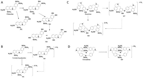 The proposed metabolic pathways of palmatine (A), tetrahydropalmatine (B), dauricine (C), and tetrandrine (D) in intestinal flora after incubation in vitro.