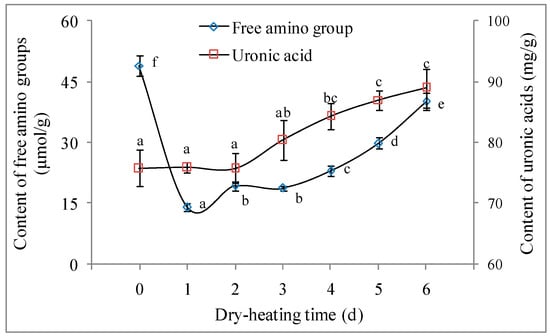 Change of free amino group content and uronic acid content of longan pulp polysaccharide-protein mixtures during dry-heating. The statistical difference (p < 0.05) among the samples dry-heated for 0–6 days is indicated by different letters. Data are represented as mean ± SD of three replicates.