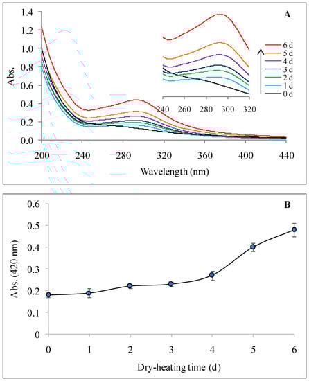 Change of ultraviolet-visible spectrum (A) and 420 nm absorbance (B) of longan pulp polysaccharide-protein mixtures during dry-heating.