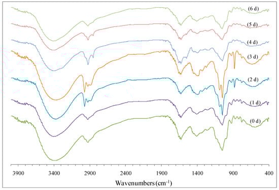 FTIR spectroscopy can be also used to investigate the interaction between protein and carbohydrate [16,28,29]. The FTIR spectra of LPPMs dry-heated for different times showed obvious differences (Figure 3). The band changed in the amide I region (about 1650 cm−1), especially on the 4th day; this could be related to the generation of typical Maillard reaction products (i.e., a Schiff base imine group and enaminol group) and the formation of covalent bonds between carbonyl group and amino group [28]. The bands known as C–N stretching and N–H deformation in the amide II region (1480–1575 cm−1) and the amide III region (1240–1450 cm−1) displayed increasing intensities in the first 3 days, then gradually weakened. This change was similarly described in some previous studies [29,30]. In addition, other bands influenced by dry-heating were as following: the asymmetric and symmetric stretching vibration bands of alkyl groups (–CH2– and –CH3) at 2974 and 2854 cm−1; the N–H bending vibration band of amide II at 1551 cm−1; the C–O stretching vibration band of anhydroglucose ring at 1087 cm−1 [31]; the out-of-plane C–H bending vibration band of aromatic ring at 880 cm−1 [32]. All these results indicated the presence of the complicated Maillard reaction of LPPMs under dry-heating. Compared with polysaccharides from fresh longan pulp, those from dried longan pulp bound more proteins with stronger interaction force against ultrasonic dissociation [9]. It is suggested that Maillard-type conjugation between polysaccharides and proteins may also occur in longan pulp during hot air drying.
