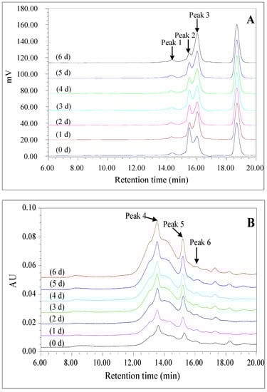 Change of molecular weight distribution of longan pulp polysaccharide-protein mixtures (LPPMs) during dry-heating. The high-performance size exclusion chromatogram of LPPMs was simultaneously performed with a refractive index detector (A) and a photo-diode array detector (B).