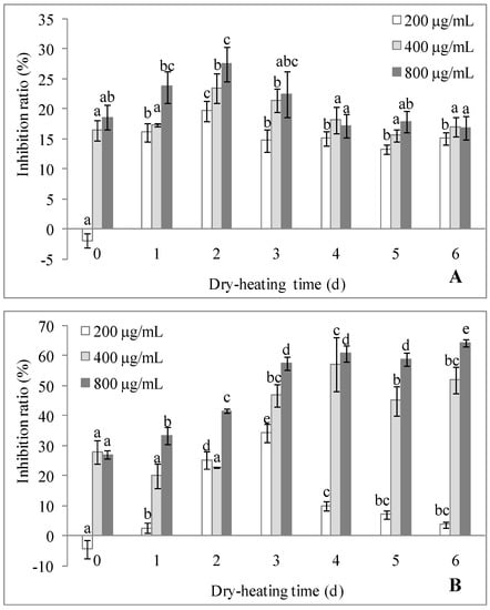 The inhibitory activity of LPPMs against SGC7901 cells could be also improved by dry-heating (Figure 5B). At the dose of 200 μg/mL, LPPMs did not inhibit the proliferation of SGC7901 cells initially, but obtained the inhibition ratio of 34.39% after 3 days of dry-heating. LPPMs heated for 3 days exhibited the inhibition ratio of 46.83% and 57.40% at 400 μg/mL and 800 μg/mL, respectively. The values showed no obvious difference from those of LPPMs heated for 4 days or 5 days (p > 0.05). The highest inhibition ratio of 64.37% belonged to 800 μg/mL of 6-day heated LPPMs.
