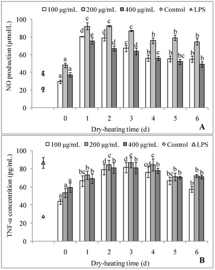 Macrophage-stimulating activities of longan pulp polysaccharide-protein mixtures dry-heated for different times. The nitric oxide production (A) and tumor necrosis factor α secretion (B) of mouse leukemic monocyte macrophages (RAW 264.7) were evaluated. The statistical difference (p < 0.05) among the samples at the same dose is indicated by different letters. Data are represented as mean ± standard deviation of four replicates.