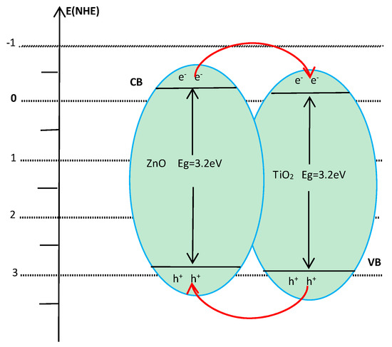 Coupling with another semiconductor is regarded as a good method to improve the photocatalytic activity of TiO2. Reportedly, ZnO is an excellent n-type semiconductor material exhibiting promising efficiency for photocatalytic oxidation of organic contamination. It is due to the intimate interfacial interaction between ZnO and TiO2 via chemical bonding that ZnO can uniformly graft on the surface of TiO2 to form the heterojunction. The mechanism for charge transfer in composite TiO2-ZnO film can be graphically shown in Figure 1. The slight negative shift of the ZnO band facilitates the injection of electrons from the CB of ZnO to the CB of TiO2, and the migration of holes from the VB of TiO2 to the VB of ZnO upon illumination, which effectively increase the availability of e− and h+ for targeted redox processes by reducing their recombination [10]. The technique may improve the photocatalytic performance of TiO2 in a certain extent, but still cannot meet the actual needs. In order to effectively photodegrade organic pollutants, other modification methods also need to be used.