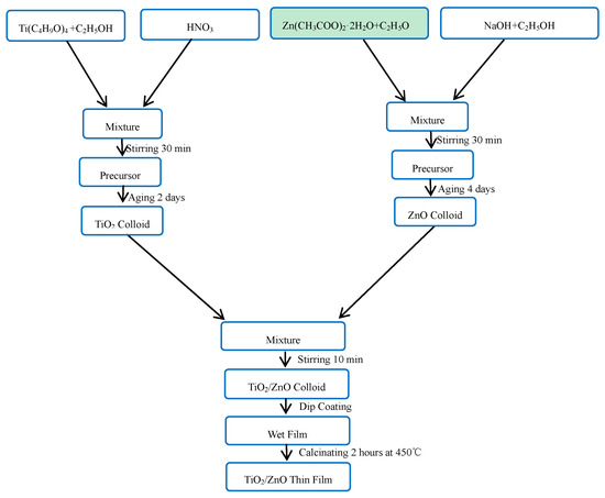 All reagents and chemicals were of analytical grade without any further purification and the water used was double-distilled deionized, invariably, in our experiment. Pure TiO2, composite TiO2/ZnO, Co doped TiO2/ZnO, B doped TiO2/ZnO, and Co-B codoped TiO2/ZnO films were prepared via applicable sol-gel technique employing tetrabutyl titanate (Ti(C4H9O)4) and zinc acetate dihydrate (Zn(CH3COO)2·2H2O) as metal sources. The TiO2 sol was prepared using tetrabutyl titanate, ethanol absolute (solvent), nitric acid (0.2 mol/L, catalyst) in a volume ratio of 1:20:20, correspondingly, in a clean and dry vessel at ambient temperature. The process was completed with vigorous stirring about 30 min till the homogeneous colloidal suspension was obtained, and the preparation procedure is described in detail in reference [14]. The ZnO sol was prepared as follows: the first step is to prepare 5 × 10−3 mol/L zinc acetate ethanol solution, in which a certain amount of zinc acetate was dissolved in anhydrous ethanol under vigorous stirring. Then, in a volume ratio of 1:9, 2 × 10−2 mol/L sodium hydroxide ethanol solution was added to the above solution dropwise with magnetic stirring for 30 min at room temperature. A transparent ZnO-sol was obtained after for two days [15]. The flow chart of TiO2/ZnO composite film preparation is shown in Figure 2.