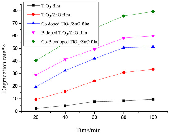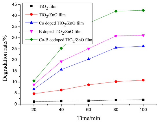Formaldehyde as a carcinogen is an organic pollutants which can be also frequently detected in wastewater [17]. Figure 4 shows decomposition kinetics of formaldehyde solutions using pure TiO2, composite TiO2/ZnO, Co doped TiO2/ZnO, B doped TiO2/ZnO, and Co-B codoped TiO2/ZnO films on glass substrates under visible light irradiation for 100 min. Compared with pure TiO2 film 9%, the degradation percentage of formaldehyde solutions using TiO2/ZnO, Co doped TiO2/ZnO, B doped TiO2/ZnO, and Co-B codoped TiO2/ZnO film has reached 34%, 51%, 60% and 80%, respectively, during use time in our test. Therefore, the prepared Co-B codoped TiO2/ZnO film is effective for the decomposition of both formaldehyde and oxytetracycline solutions under visible light irradiation. The oxytetracycline solution is more difficult due to its stable naphthacene ring structure compared to the degradation for formaldehyde.