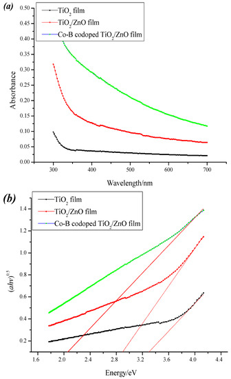 UV–Vis absorption spectra (a) and the band gap (b) of pure TiO2, composite TiO2/ZnO, and Co-B codoped TiO2/ZnO films.