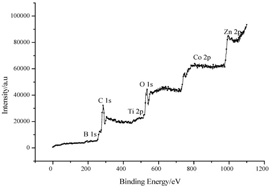 X-ray photoelectron spectroscopy can be carried out to determine the surface elemental composition of the catalyst. Figure 9 shows XPS image of Co-B codoped TiO2/ZnO film calcined at 450 °C for 1 h. From Figure 9, the characteristic peaks of B 1s, C 1s, Ti 2p, O 1s, Co 2p, and Zn 2p are observed with the binding energies of ~195, 285, 459, 531, 799, and 1044 eV, respectively, consistent with the values reported in literature [22,23]. The presence of C element may come from residual carbon of organic precursors used in the sol-gel method and adventitious hydrocarbon. A weak broad peak with a binding energy centered at ~195 eV is observed for the sample, indicating that the B species may mainly occupy the interstitial site of TiO2. In addition, it is found that the incorporation of Co species also facilitates the formation of oxygen vacancies, which may be due to charge imbalance associated with the substitution of Ti4+ ions. Composition analysis by energy-dispersive spectroscopy (EDS) indicates that the atomic concentrations of Ti, O, Zn, Co, B, and C in the film are 15.12, 64.90, 0.62, 0.47, 0.79, and 18.10%, respectively.