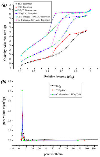 Specific surface areas play an important role in influencing the photocatalytic activity of TiO2. Figure 10 shows N2 adsorption/desorption isotherms (a) and pore size distribution (b) of pure TiO2, composite TiO2/ZnO, and Co-B codoped TiO2/ZnO powders. From Figure 10a, the isotherms of the samples exhibit distinct hysteresis loops from 0.4 to 1.0 at high relative pressures. The distinct hysteresis loop is indicative of a bottle-neck mesoporous structure existed, possibly caused by non-uniform pore size. Compared with pure TiO2 and composite TiO2/ZnO, the Co-B codoped TiO2/ZnO sample has largest adsorption quantities at the same relative pressure. The surface area of pure TiO2, composite TiO2/ZnO, and Co-B codoped TiO2/ZnO are 47.8, 74.6, and 115.8 m2/g, respectively. The three samples have a similar narrow pore size distribution, but their pore volumes are different as shown in Figure 10b. In our case, the pore volumes are 0.077, 0.092, and 0.104 cm3/g for pure TiO2, TiO2/ZnO, and Co-B codoped TiO2/ZnO samples, respectively. The large surface area and pore volume can effectively adsorb more H2O, O2, and pollutants on the reactive sites of the catalysts, thus improving the photocatalytic activity of the modified TiO2.