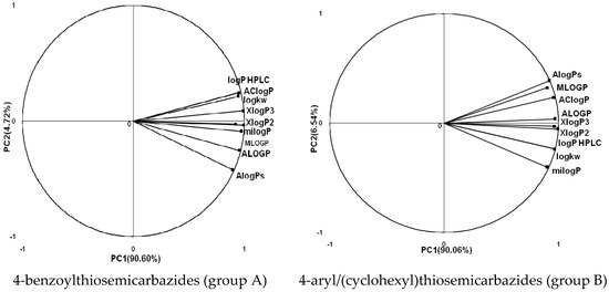 In the next step, the comparison between the experimental logPHPLC and the calculated values logP was carried out. For analysis, thiosemicarbazide derivatives 1–17 were divided into two groups; the first one (group A) included 4-benzoylothiosemicarbazides 1–10, and the second one (group B) included 4-aryl and 4-cyclohexylthiosemicarbazides 11–17. Based on the correlation matrices (Table 3 and Table 4) and PCA (Figure 1), it was found that for group A, the highest correlation was obtained using the XlogP3 program, while for group B the highest correlation was obtained using the XlogP2 program.