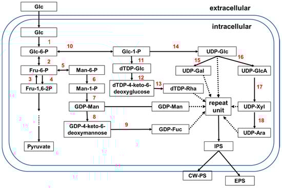 Enzyme activities of glucokinase (GK) [16], UDPG-dehydrogenase (UGDG) [11], and dTDP-Glc pyrophosphorylase (dTDP-GPP) [10,70] have also been investigated. However, these studies showed no notable association between PS biosynthesis and activities of these enzymes.