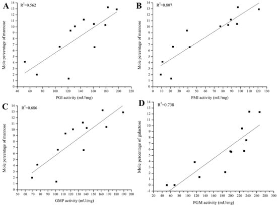 Correlations (R2) between activities of exopolysaccharide (EPS) synthesis enzymes and monosaccharide mole percentages under various carbon source conditions. (A) Phosphoglucose isomerase (PGI) and Man; (B) Phosphomannose isomerase (PMI) and Man; (C) GDP-Man pyrophosphorylase (GMP) and Man; (D) Phosphoglucose mutase (PGM) and Gal.