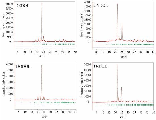 Once the molecular replacement and the subsequent energetic minimization of all the crystals are performed, the starting structural models are used to start the Rietveld refinements [57,58] in the FULLPROF program [50]. Refinements were carried out in an angular range of 2.0–70.0° in 2θ with slight constraints in angles and bonds. The hydrocarbon chain was treated as a quasi-rigid body (including all the hydrogen atoms) allowing the free rotation of the terminal groups C-O-H. The center of the rigid-body is expressed in orthonormal coordinates (xc, yc and zc). This absolute position and the Euler angles describing the molecular body orientation (θ, ω, ψ) were refined. In the molecule of odd-numbered members, the central C atom acts as the center, whereas the midpoint of the distance separating two central C atoms in the hydrocarbon chain of DEDOL and DODOL is the corresponding center point. During the initial cycles of Rietveld refinement, the profile parameters and unit cell were kept constant, allowing refinement of the scale factor, zero shift and the intensity of the background points.